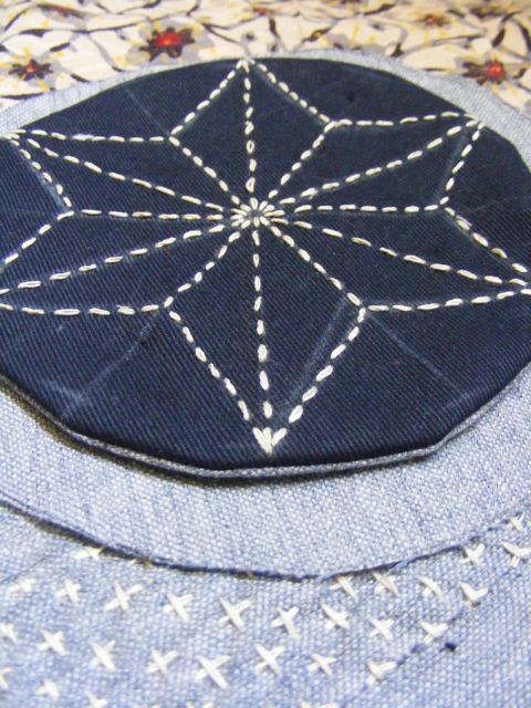 For the base, I've used a little of the heavy blue cotton I had left over from my fisherman's smock, while the body is made from one of Patrick's old linen shirts. But it is the lining I love best–a beautiful piece of cream, lilac and ruby silk that was once a kimono sleeve. As for the Shashiko, I've kept it simple–a hemp leaf on the base, and a band of crosses on the body.